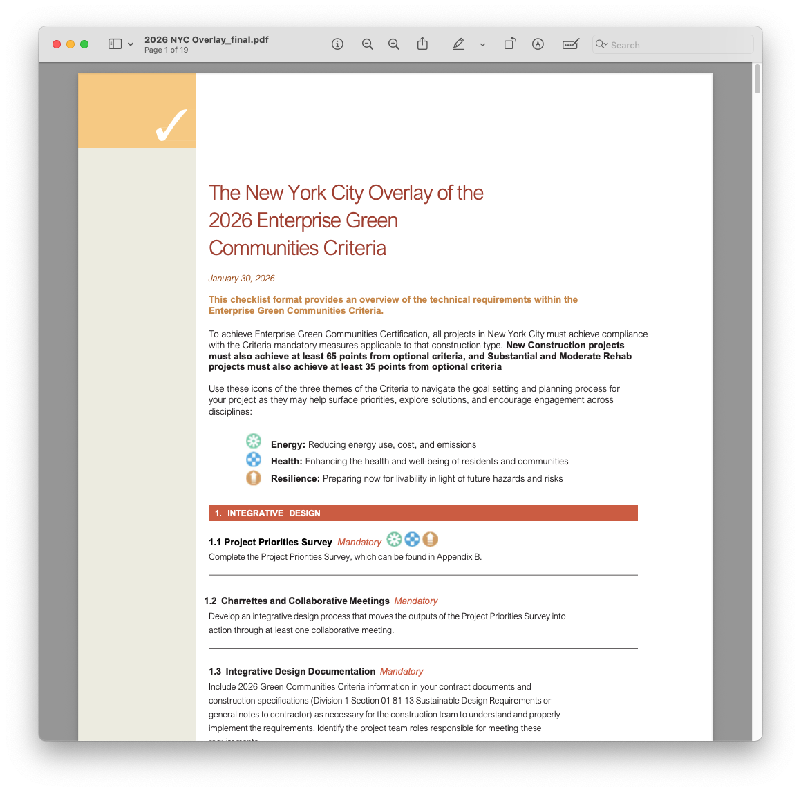 Similar to the national Criteria, projects in New York City may choose to submit their Prebuild applications with the 2020 Overlay or 2026 Overlay between April and the end of September. Starting October 1st, we’ll retire the 2020 Overlay for first time Prebuild applications. Download the 2026 NYC Overlay checklist to tally your points and track progress. Substantial and Moderate Rehab projects are required to earn at least 35 optional points, and New Construction projects are required to earn at least 65 points.
